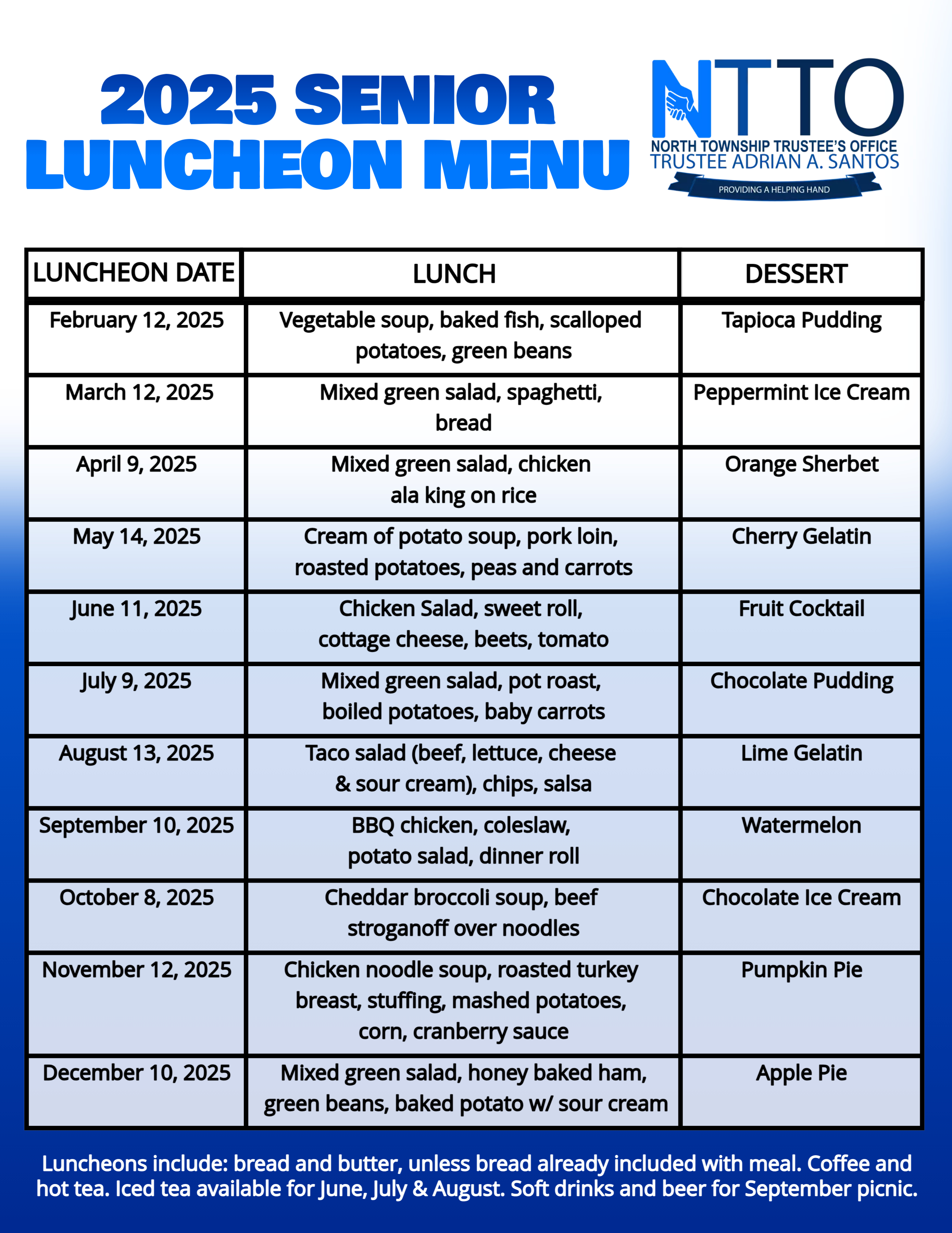 - The North Township Trustee also offers monthly Senior Luncheons at Wicker Memorial Park Social Center. For $7, seniors may enjoy great food, entertainment, guest speakers and door prizes. Click here for our menus.